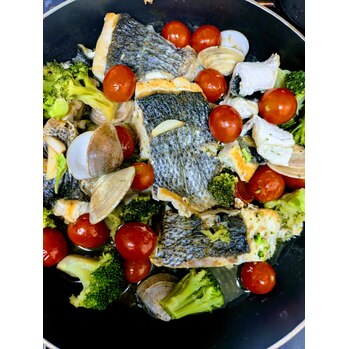 スズキと、アサリ、トマト、ブロッコリーをフライパンに並べて焼いて蒸すだけ。とっても簡単なのに、見た目も華やかで美味しかったです。